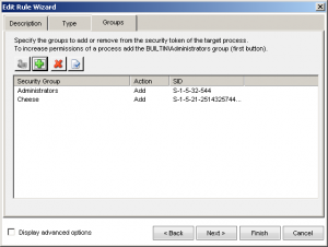 Additionally you can add other groups to the security token of the process. Advanced options allow you to manage the actual privileges.