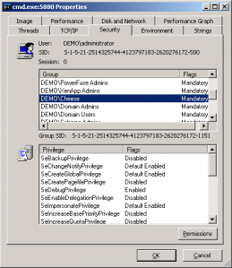 As you can see, the security group DEMO\Cheese has been added to the cmd.exe process.