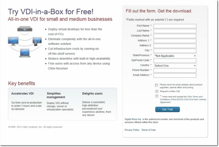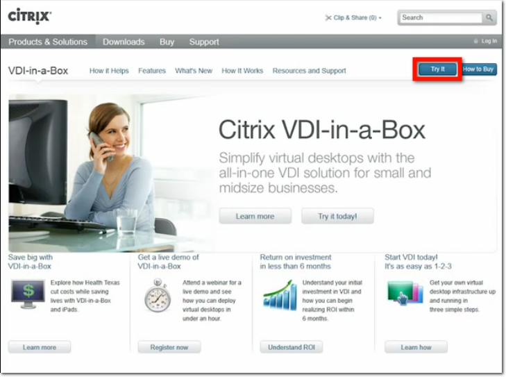 The first thing to do of course, is to download the installation file. Go to Citrix.com > Products and Solutions > Desktop Virtualization > VDI-in-a-Box, and then click the Try it button.