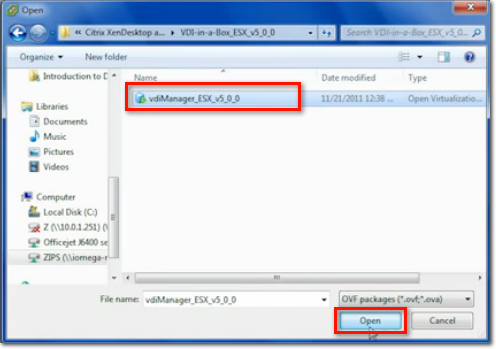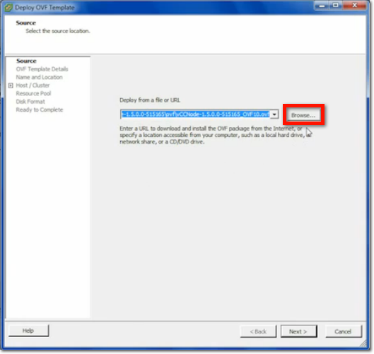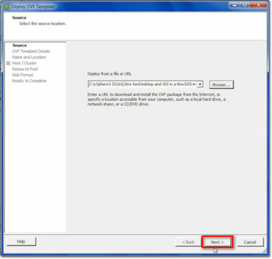 When the next window launches and you're asked to select the source location, browse to the folder where you stored the OVF file, select the file, and click Open.