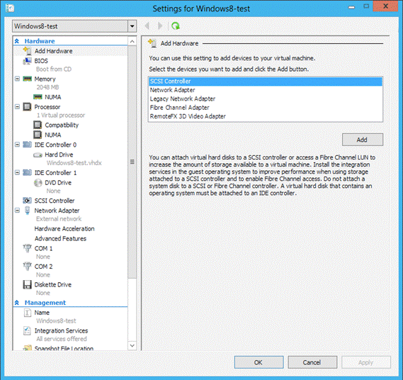 - SCSI controller. With Hyper-V 3.0, you can add virtual hard disks to a SCSI controller or to a Fibre Channel adapter to a virtual machine in order to increase the amount of storage that’s available on the server. You cannot boot from a virtual disk that’s hosted on a SCSI controller. Only a hard disk attached to an IDE adapter can host an operating system.
