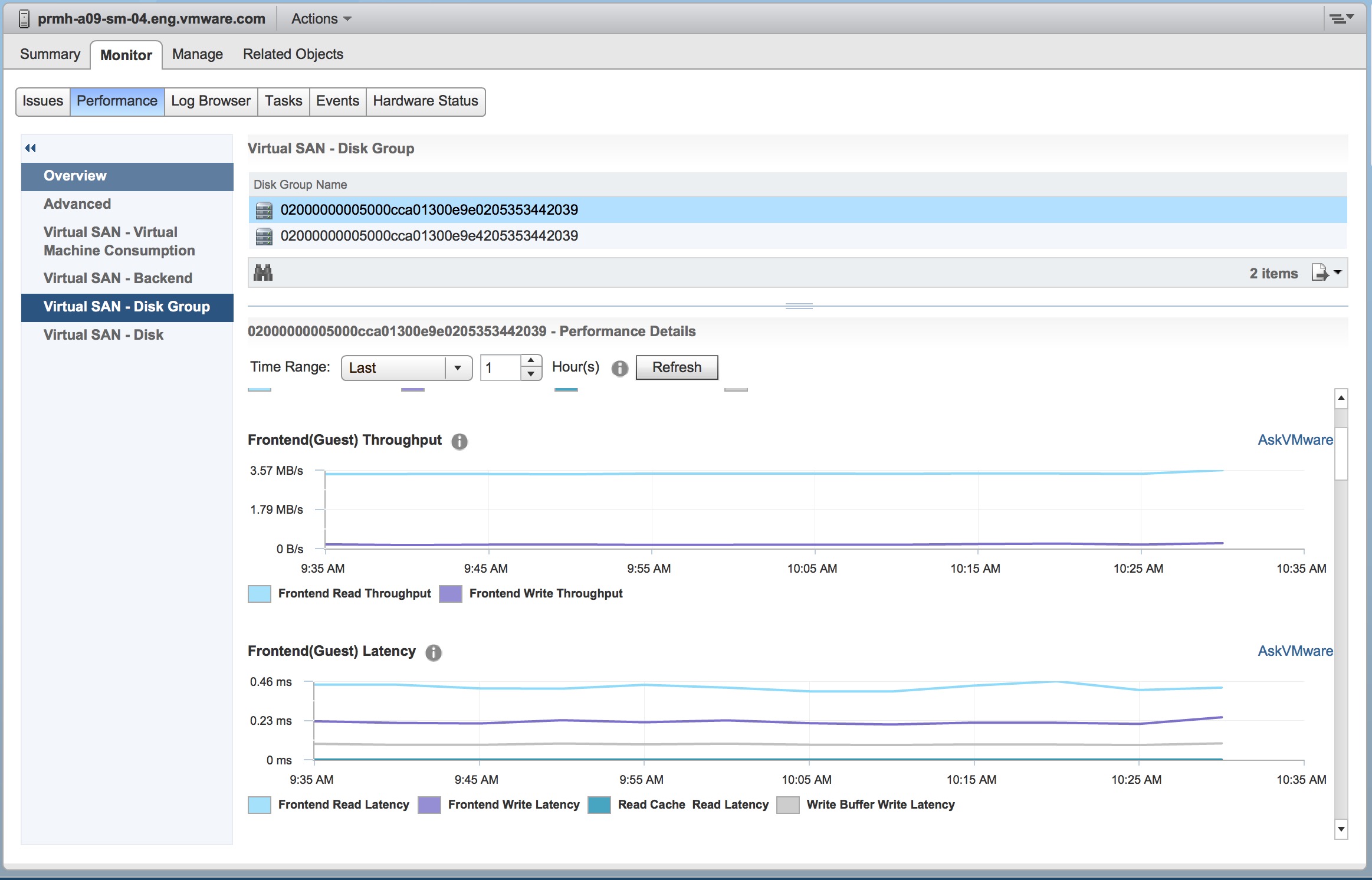 Performance Monitoring Service allows customers to be able to monitor existing workloads from the vCenter. Customers needing access to tactical performance information will not need to go to vRO. Performance monitor includes macro level views (Cluster latency, throughput, IOPS) as well as granular views (per disk, cache hit ratios, per disk group stats) without needing to leave vCenter. The performance monitor allows aggregation of states across the cluster into a “quick view” to see what load and latency look like as well as share that information externally directly to 3rd party monitoring solutions by API.The Performance monitoring service runs on a distributed database that is stored directly on Virtual SAN.